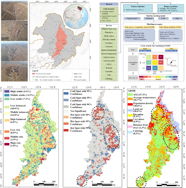 近日,東北地理所黑土退化與修復(fù)學(xué)科組郭明明研究團隊提出了一種新的溝道侵蝕風(fēng)險模型構(gòu)建方法(GERM),該方法將溝蝕敏感性模擬與溝道密度模擬相結(jié)合,預(yù)測了漫川漫崗黑土區(qū)全區(qū)(17.76萬 km2)的溝蝕發(fā)育風(fēng)險。研究采用分層隨機抽樣方法選取了424個4×4 km2區(qū)域,通過0.3~0.6 m分辨率Google Earth影像對樣方中的侵蝕溝進(jìn)行解譯,并抽取30%進(jìn)行實地調(diào)查以保證解譯精度。結(jié)果表明,漫川漫崗黑土區(qū)侵蝕溝平均長度為335.85 m,平均溝壑密度為250.35 m/km2。GERM綜合考慮了Random Forest、XGBoost、KNN以及人工神經(jīng)網(wǎng)絡(luò)四種機器學(xué)習(xí)模型,結(jié)果顯示XGBoost模型表現(xiàn)最佳(AUC=0.999)。全局莫蘭指數(shù)表明溝蝕風(fēng)險存在顯著的空間聚類特征,漫川漫崗黑土區(qū)溝蝕高風(fēng)險區(qū)面積占比高達(dá)12.9%,且這些風(fēng)險區(qū)分布于全區(qū)的中東部、西北部和南部。此外,氣候是驅(qū)動侵蝕溝形成的關(guān)鍵因素,地形和氣候共同決定了全區(qū)溝蝕強度的空間異質(zhì)性,而侵蝕溝未來進(jìn)一步發(fā)育的風(fēng)險則受控于地形、氣候和人類活動的綜合影響,其中匯水地形指數(shù)(AS2)、氣溫、人口密度、土地利用主控區(qū)域面積占比分別為47.3%、18.7%、10.6%、10.4%。南部風(fēng)險區(qū)主要受AS2影響,東部風(fēng)險區(qū)主要受AS2、氣溫、土地利用影響,東北部向小興安嶺過渡地帶溝蝕風(fēng)險主要受人類活動強度(土地利用和人口密度)的影響,而西北部風(fēng)險區(qū)受控因素更為復(fù)雜多樣。研究結(jié)果可為東北黑土區(qū)侵蝕溝防控與治理提供科學(xué)依據(jù)。