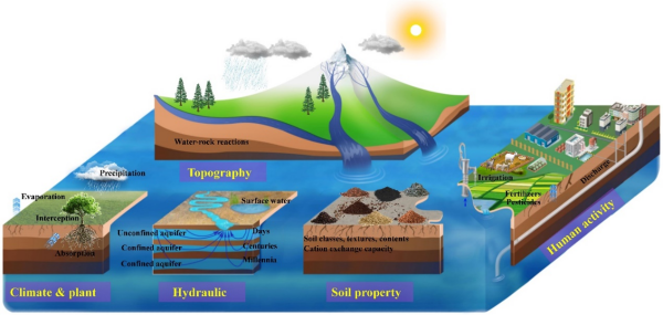 圖1 地下水溶質(zhì)動(dòng)態(tài)示意圖,展示了自然過(guò)程(如氣候、土壤性質(zhì)、植物吸收和地下水-地表水相互作用)與人為干擾(如城市化、農(nóng)業(yè)、廢物處置)之間的水力聯(lián)系與相互作用,以及它們對(duì)地下水系統(tǒng)的綜合影響。