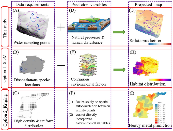 該研究系統(tǒng)采集了淺層地下水、深層地下水和地表水樣本,建立了包含地形、氣候、水力聯(lián)系、土壤特性和人類活動(dòng)等五大類環(huán)境因子的多維數(shù)據(jù)庫(kù)。創(chuàng)新性地將溶質(zhì)濃度類比為生態(tài)系統(tǒng)中的物種"適生性",利用SDM模型模擬其在地下水系統(tǒng)中的空間分布規(guī)律。通過(guò)引入端元混合分析(EMMA)、隨機(jī)森林和AICc模型選擇等先進(jìn)算法,有效解決了野外觀測(cè)數(shù)據(jù)不足的難題,預(yù)測(cè)精度較傳統(tǒng)空間插值方法(如克里金法)提升30%以上。