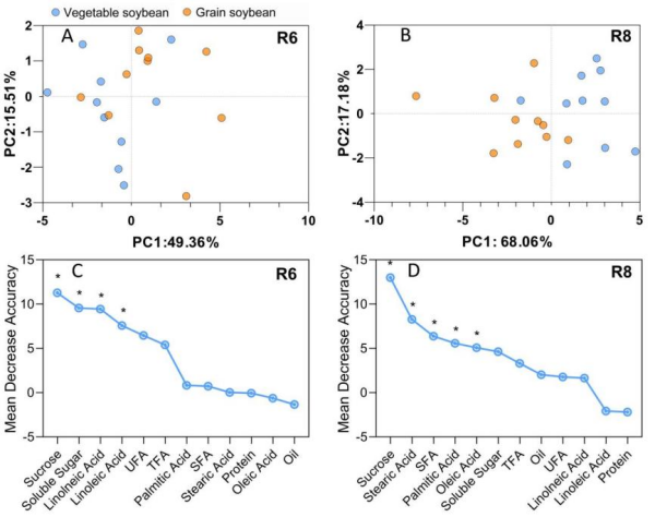 本研究選取了10個鮮食大豆和10個粒用大豆品種(系),對其營養(yǎng)成分進行了全面比較。研究發(fā)現(xiàn),鮮食大豆在蔗糖、可溶性糖和粗蛋白含量上顯著高于粒用大豆,而在粗脂肪和總脂肪酸含量上則相對較低。在鮮莢階段,鮮食大豆含有較高比例的不飽和脂肪酸,尤其是油酸。通過主成分分析(PCA)和機器學(xué)習(xí)算法,發(fā)現(xiàn)鮮食大豆和粒用大豆在營養(yǎng)組成上存在明顯差異,并且蔗糖是區(qū)分鮮食大豆和粒用大豆的最關(guān)鍵營養(yǎng)標(biāo)志物(圖1)。