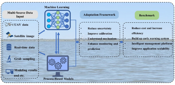圖1. 耦合多源數(shù)據(jù)、機(jī)器學(xué)習(xí)與過(guò)程模型的水質(zhì)監(jiān)測(cè)、預(yù)測(cè)、管理協(xié)同框架圖