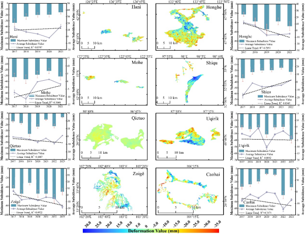 研究團隊融合小基線集(SBAS-InSAR)時序干涉技術與機器學習模型,基于2017–2023年Sentinel-1衛星C波段雷達影像,實現了全國尺度泥炭地地表形變的高精度反演與預測,系統揭示了其空間格局與主要驅動機制。結果表明,我國泥炭地沉降現象普遍存在:若爾蓋泥炭地平均沉降速率為?5.73 mm/a,最大沉降量超過?65 mm;草海泥炭地最大沉降速率達?39.91 mm/a;大興安嶺地區受多年凍土退化影響出現緩慢沉降,而長白山部分泥炭地則保持穩定。