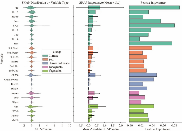 泥炭地垂直退化驅動分析結果表明,降水量(Pre,SHAP = 0.719)是影響泥炭地沉降的首要因子,凈初級生產力 (NPP,SHAP =0.600) 、干旱指數 (SPEI,SHAP =0.554)和牲畜密度 (Livestock density,SHAP=0.427) 緊隨其后。氣候干旱化與放牧擾動的疊加是驅動西部泥炭地垂直退化的關鍵機制,而凍土退化則成為寒區泥炭地的新型驅動力。