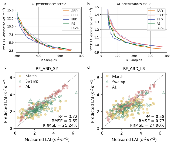 為解決上述科學(xué)問題,中國科學(xué)院東北地理所濕地遙感研究團(tuán)隊基于多年野外原位數(shù)據(jù)積累與多源遙感數(shù)據(jù),率先構(gòu)建了一套面向全國尺度的濕地LAI混合反演與制圖方法框架,實現(xiàn)了我國國家尺度濕地植被生態(tài)參數(shù)、10 m空間分辨率的突破。該研究整合了2013–2023年期間我國不同濕地植被類型的865組野外實測LAI數(shù)據(jù),通過遙感云計算平臺融合多源衛(wèi)星影像(Sentinel-2與Landsat-8),創(chuàng)新性地提出一種“物理模型+主動學(xué)習(xí)+機(jī)器學(xué)習(xí)回歸”的混合建模策略。通過經(jīng)典輻射傳輸模型(PROSAIL-5B)增強模型可解釋性,采用主動學(xué)習(xí)技術(shù)優(yōu)化訓(xùn)練樣本分布,緩解病態(tài)反演和樣本冗余問題,提高復(fù)雜濕地生物群系下的模型泛化能力,結(jié)合隨機(jī)森林機(jī)器學(xué)習(xí)算法建立高效穩(wěn)健的LAI反演模型。