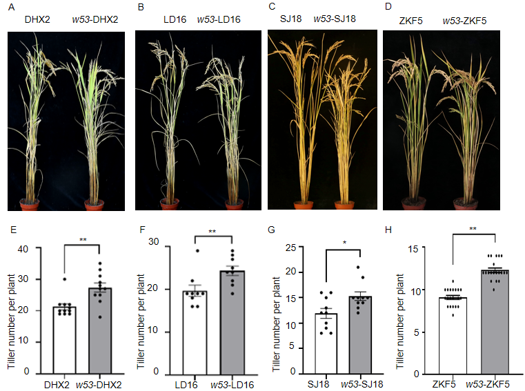 圖1. 不同背景下oswrky53材料分蘗數(shù)均顯著增加