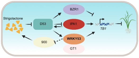 圖2. OsWRKY53調(diào)控水稻分蘗及微調(diào)獨腳金內(nèi)酯信號的模式圖