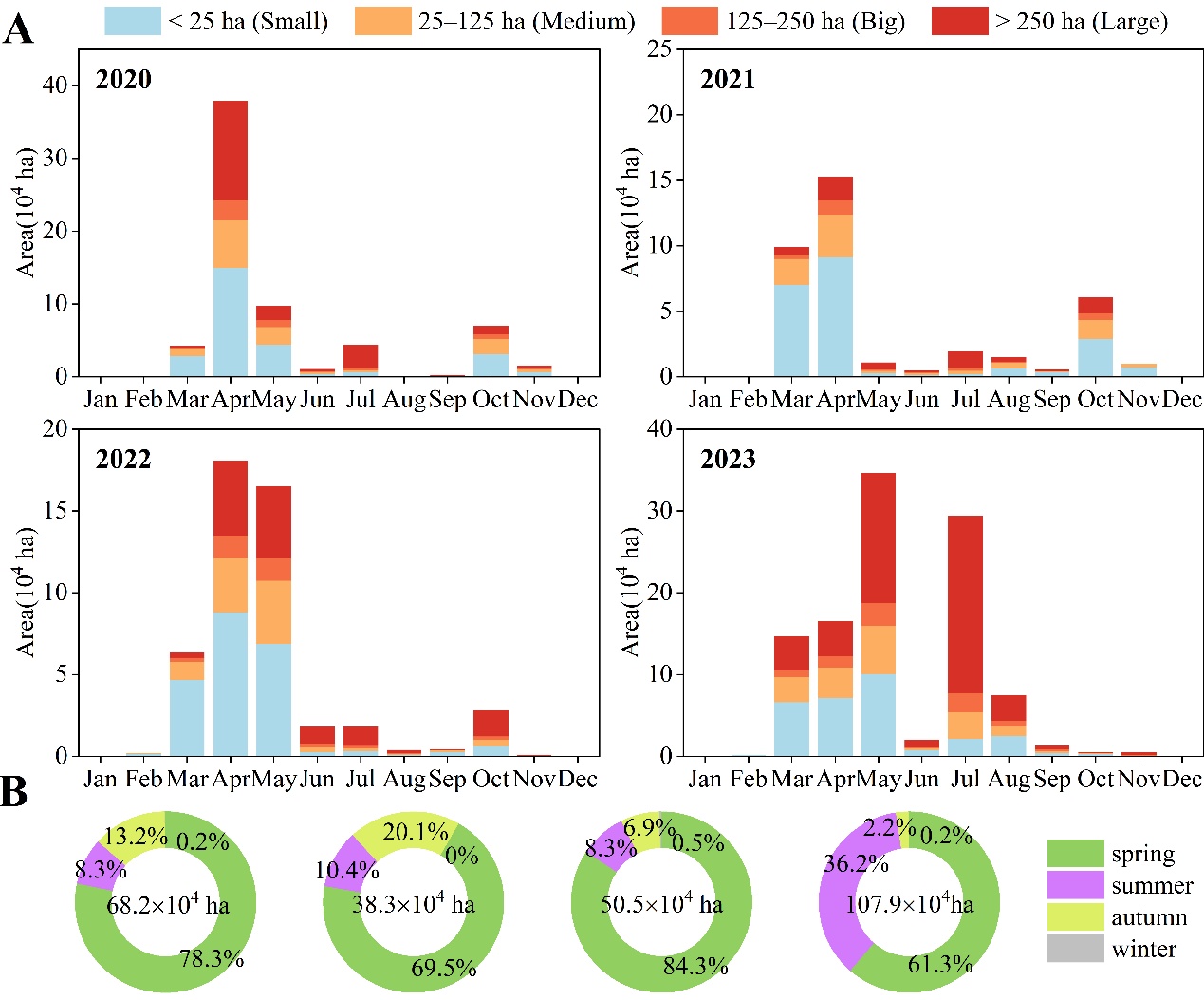 圖2 2020—2023 年黑龍江流域森林火燒跡地面積變化特征。(A) 不同燃燒斑塊的月度變化特征;(B) 火燒跡地面積的季節(jié)分布特征。