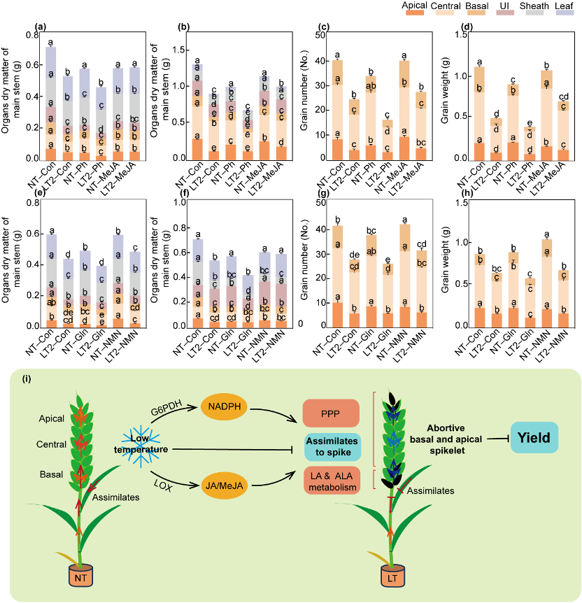 該研究于小麥藥隔期開展低溫處理試驗,結果表明,低溫處理導致小麥主莖產量顯著下降,其中穗基部和頂部小穗的敗育率顯著升高。通過整合常規(guī)代謝組學、空間代謝組學及轉錄組學分析,闡明了小麥葉片、穗下節(jié)間以及穗部不同區(qū)域對低溫脅迫的代謝和轉錄差異響應,證實低溫脅迫下,小麥通過激活亞油酸/α-亞麻酸代謝啟動茉莉酸介導的防御反應,并通過磷酸戊糖途徑維持碳代謝平衡和能量供應。這兩條途徑的協(xié)同作用,決定了碳水化合物能否從源葉高效轉運至穗部,并在小穗間進行合理分配,進而有效緩解低溫導致的產量損失。該研究為解析作物逆境適應與產量形成的平衡調控機制提供了全新視角,也為小麥田間抗逆栽培技術的指定與優(yōu)化提供了重要理論依據(jù)。
