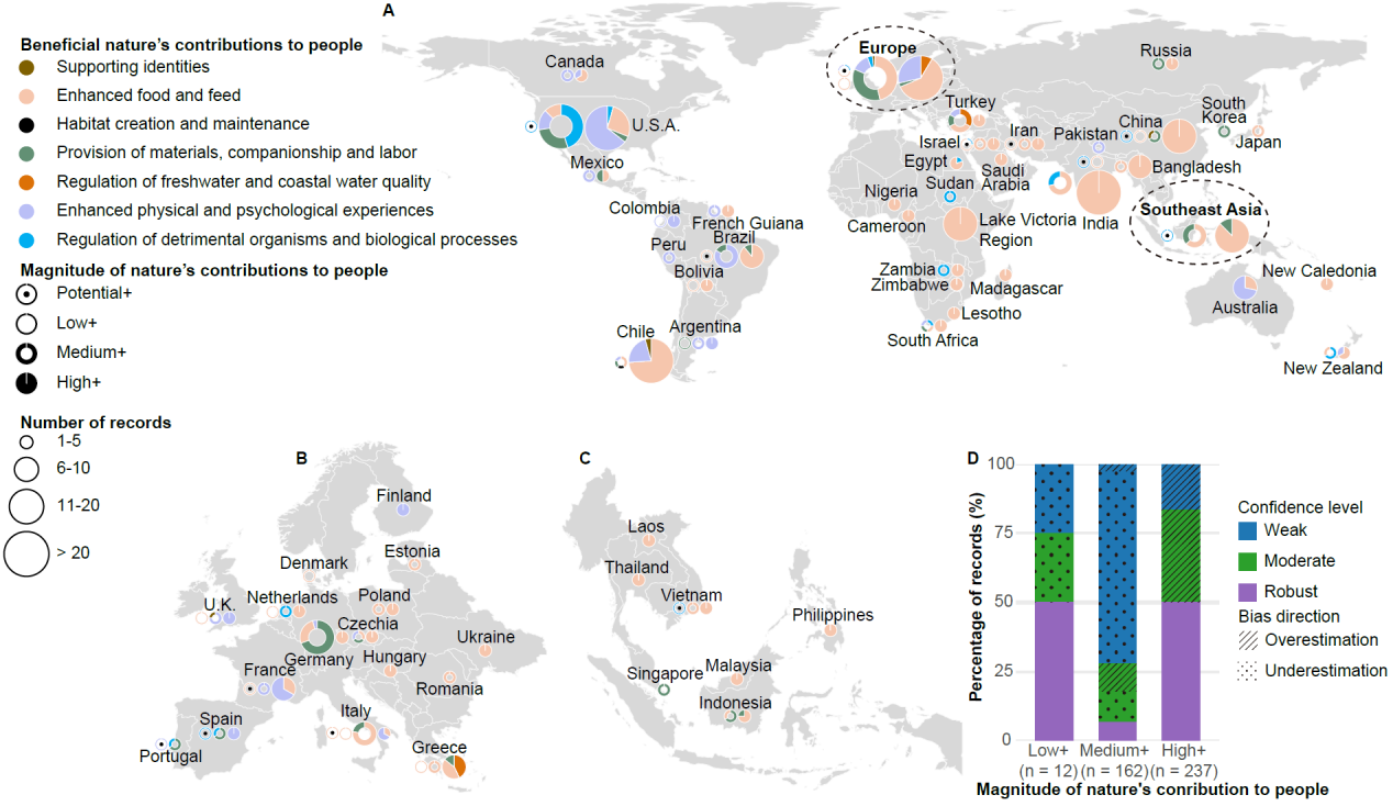 該研究基于“自然對(duì)人類貢獻(xiàn)(Nature’s Contributions to People)”框架開發(fā)了一套半定量評(píng)估方法,系統(tǒng)性評(píng)估了全球外來淡水大型動(dòng)物對(duì)人類社會(huì)產(chǎn)生的正面與負(fù)面影響。研究結(jié)果表明,已有 93種外來淡水大型動(dòng)物(占現(xiàn)存物種的43%)被引入到其本土分布區(qū)之外,涵蓋了魚類、哺乳類、爬行類和兩棲類。該研究共識(shí)別了429項(xiàng)正面社會(huì)經(jīng)濟(jì)效應(yīng)記錄(圖1),包括提升食物供給(57%)、促進(jìn)休閑漁業(yè)和生態(tài)旅游(20%)以及提供生產(chǎn)和貿(mào)易所需的原材料供給(12%)等。一些淡水大型動(dòng)物如鯉魚(Cyprinus carpio)、草魚(Ctenopharyngodon idella)和尖齒胡鯰?(Clarias gariepinus)等在全球多地被引入后已成為當(dāng)?shù)鼐用裰匾氖澄飦碓春蜐O業(yè)資源,而尼羅鱷(Crocodylus niloticus)和暹羅鱷等(Crocodylus siamensis)則常被引入到本土分布區(qū)之外用于發(fā)展養(yǎng)殖業(yè)和寵物貿(mào)易。研究還發(fā)現(xiàn),亞洲和非洲引入外來淡水大型動(dòng)物的主要?jiǎng)訖C(jī)是增強(qiáng)食物供給,而在北美則主要與休閑漁業(yè)和寵物貿(mào)易相關(guān)。