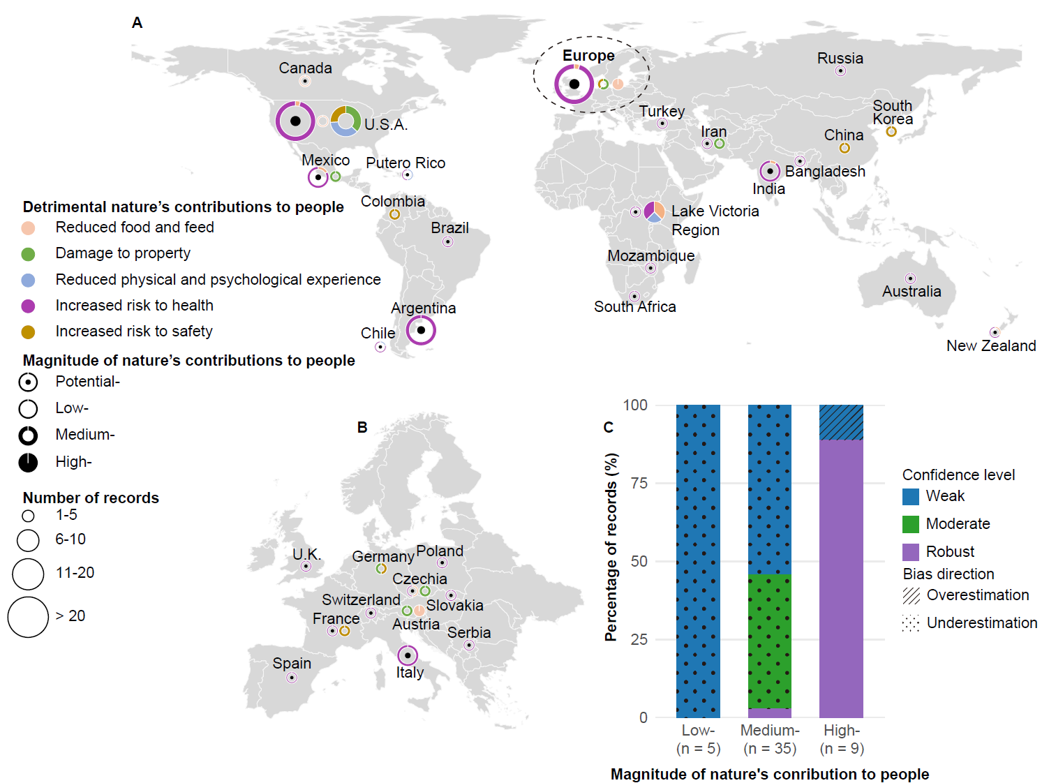 研究進(jìn)一步指出,盡管外來淡水大型動(dòng)物在引入地區(qū)帶來了可觀的經(jīng)濟(jì)收益,但其造成的負(fù)面社會(huì)經(jīng)濟(jì)影響不可忽視(圖2)。超過140項(xiàng)記錄表明外來淡水大型動(dòng)物對(duì)人類健康(63%)、食物供給(10%)和財(cái)產(chǎn)設(shè)施(10%)等造成了損害。例如,河馬(Hippopotamus amphibius)被引入到哥倫比亞后由于缺乏天敵在當(dāng)?shù)匮杆俜敝常鋸?qiáng)大的攻擊性對(duì)當(dāng)?shù)鼐用竦娜松戆踩珮?gòu)成了直接威脅。尼羅河鱸(Lates niloticus )在維多利亞湖的引入雖然創(chuàng)造了明顯的經(jīng)濟(jì)收益,卻導(dǎo)致了當(dāng)?shù)乇就留~類資源迅速下降,進(jìn)而威脅到低收入群體的食物供給并間接地促進(jìn)了疾病的傳播。由于外來物種導(dǎo)致的一些影響如生計(jì)資本下降和疾病傳播等對(duì)當(dāng)?shù)厣鐣?huì)造成的效應(yīng)具有滯后性和隱蔽性,其負(fù)面社會(huì)經(jīng)濟(jì)效應(yīng)在一些地區(qū)可能被嚴(yán)重低估。