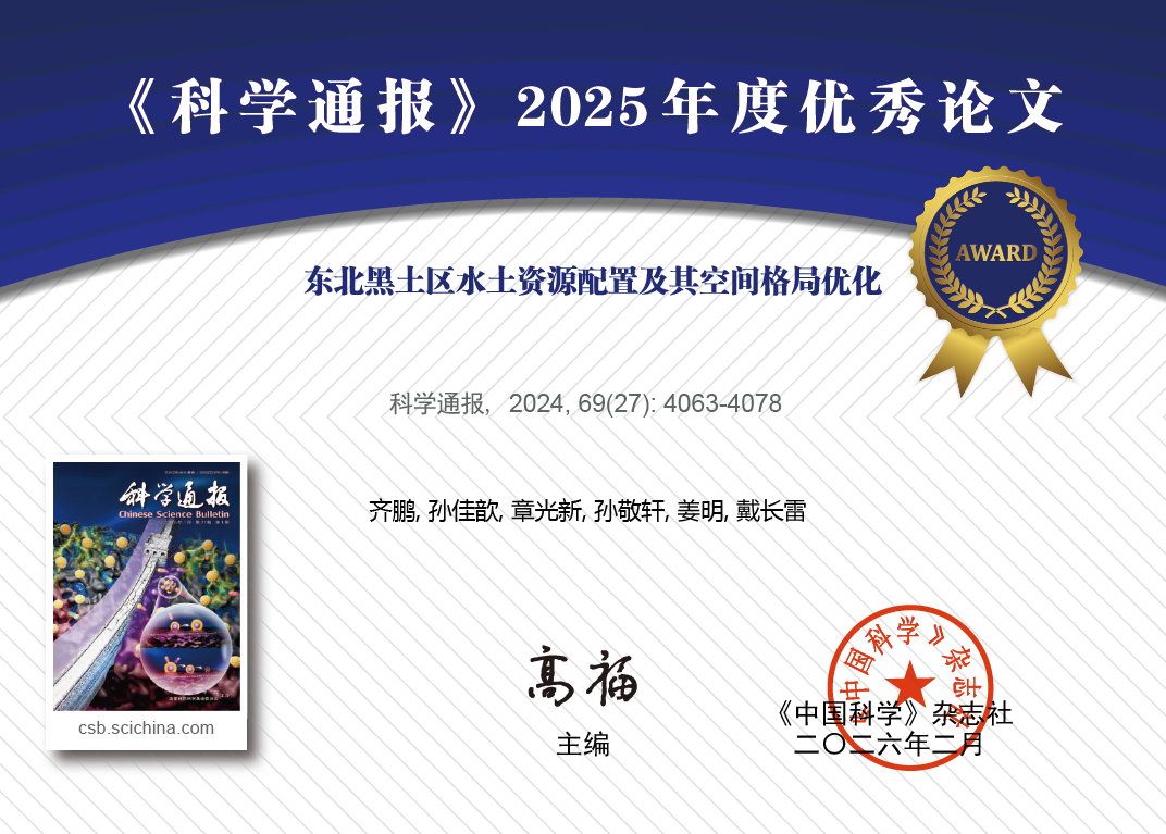 近日,國內(nèi)權(quán)威學術(shù)期刊《科學通報》公布了2025年度優(yōu)秀論文評選結(jié)果。由中國科學院東北地理與農(nóng)業(yè)生態(tài)研究所齊鵬副研究員(第一作者)、孫佳歆博士、章光新研究員、孫敬軒博士和姜明研究員(通訊作者)聯(lián)合黑龍江大學戴長雷教授等學者共同完成的研究成果——《東北黑土區(qū)水土資源配置及其空間格局優(yōu)化》,憑借論文在保障國家糧食安全與生態(tài)安全領(lǐng)域的科學貢獻與應(yīng)用價值、論文的關(guān)注度及引用率等多項指標,成功榮獲《科學通報》2025年度優(yōu)秀論文獎(圖1)。