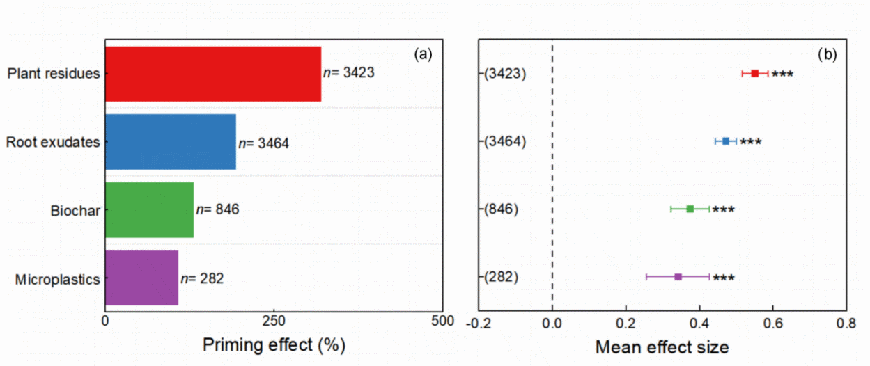 土壤是陸地生態系統中最大的有機碳庫,其微小變化即可顯著影響大氣二氧化碳濃度和全球氣候。外源碳輸入可通過激發效應促進或抑制土壤有機質的礦化,但不同碳源類型誘導的激發效應強度、方向及其驅動機制一直缺乏全球尺度的系統評估。