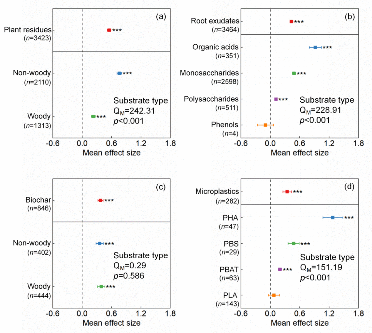 中國科學院東北地理與農業生態研究所李祿軍研究員團隊聯合浙江大學、英國雷丁大學和美國加利福尼亞大學戴維斯分校等國內外多家科研機構,在國際學術期刊Global Change Biology發表題為“Priming effects on soil organic matter mineralization by carbon substrates: A global meta-analysis”的學術論文。該研究基于100年激發效應的研究數據(1926-2026; 283篇文獻、8,015組觀測數據),首次系統比較了植物殘體、根系分泌物、生物炭和可降解微塑料四種外源碳輸入對土壤有機質激發效應的影響,并闡明了不同碳源類型及其組分特征調控激發效應的內在機制。