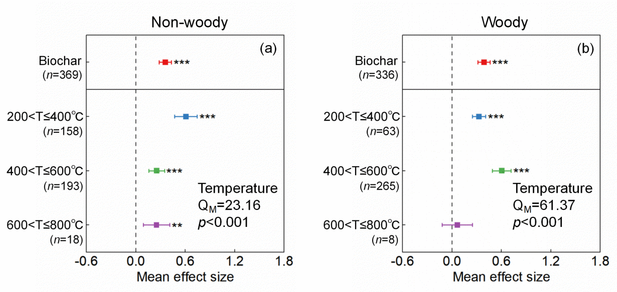 具體而言,植物殘體中富含纖維素/半纖維素的非木本植物殘體(如草本植物和農作物)使土壤有機質礦化增加113%,而富含木質素的木本植物殘體僅增加25%(圖2)。木質素較高的抗分解性及其與黏土礦物的結合是削弱激發效應的主要原因(圖4)。對于不同的根系分泌物組分,有機酸誘導的激發效應最強(土壤有機質礦化增加151%),遠高于單糖(53%)和多糖(12%; 圖2)。主要是由于有機酸通過酸化土壤釋放額外的礦質養分,并因其低分子量可直接被微生物利用,從而促進微生物的生長和激發效應的強度(圖4)。具有高芳香碳含量的木本植物來源生物炭誘導的激發效應(48%)略高于非木本植物來源生物炭(43%; 圖2)。生物炭的熱解溫度起關鍵調控作用,在200–400°C下制備的非木本植物來源生物炭誘導的激發效應最強(84%),而在400–600°C制備的木本植物來源生物炭誘導激發效應最強(83%; 圖3)。具有高降解性聚羥基脂肪酸酯(PHA)微塑料使土壤有機質礦化增加258%,而低降解性聚乳酸(PLA)對土壤有機質礦化無影響(圖2)。快速降解的微塑料(如PHA)易水解、熔點低,可快速為微生物提供碳源,從而通過激發效應促進土壤有機質的礦化;緩慢降解的微塑料(如PLA)則因降解緩慢,可通過形成“塑料際”抑制土壤有機質的礦化(圖4)。