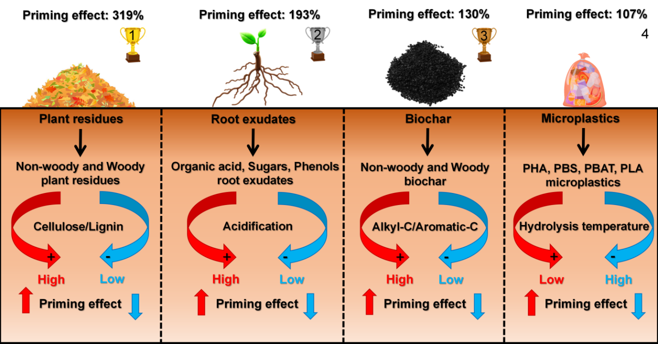 研究發現,四種外源碳均誘導正激發效應,即促進了土壤有機質的礦化,但其強度差異顯著。植物殘體誘導的激發效應最高,平均增幅達319%;其次為根系分泌物(193%)、生物炭(130%)和可降解微塑料(107%;圖1)。