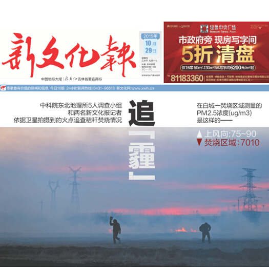 10月25、26日,長春連續出現“嚴重污染”天氣,我所區域大氣環境學科組張學磊、張世春等科研人員從10月27日至30日開展了連續四天的吉林省內秸稈露天焚燒及空氣污染現狀調研,29日《新文化報》以頭版和專版報道了本次調研的部分結果,隨后新華網、新浪網、中新網、中國網等國內各主要網絡媒體對該報道進行了大量轉載。