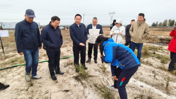 在好腰蘇木草地驗證點,子課題負責人馬紅媛研究員詳細介紹了耐鹽堿牧草品種篩選與高效建植技術、重度鹽堿地羊草頂級植被恢復與高產栽培技術等個性技術的優勢和實施效果。隨后,參加觀摩活動的領導和嘉賓共同詳細查看了耐鹽堿牧草的篩選與培育技術,深入了解到技術實施的成效以及面臨的困難,對草地驗證點的建設及技術取得的成效給予了充分肯定。