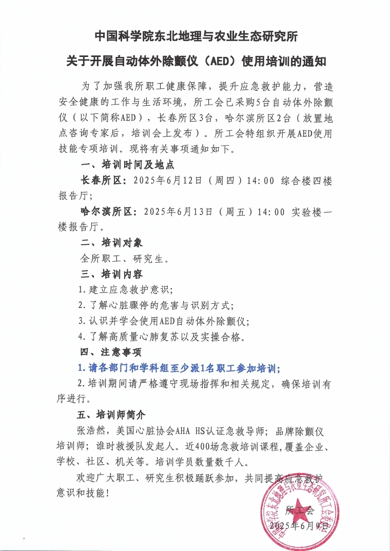 中國(guó)科學(xué)院東北地理與農(nóng)業(yè)生態(tài)研究所關(guān)于開展自動(dòng)體外除顫儀(AED)使用培訓(xùn)的通知