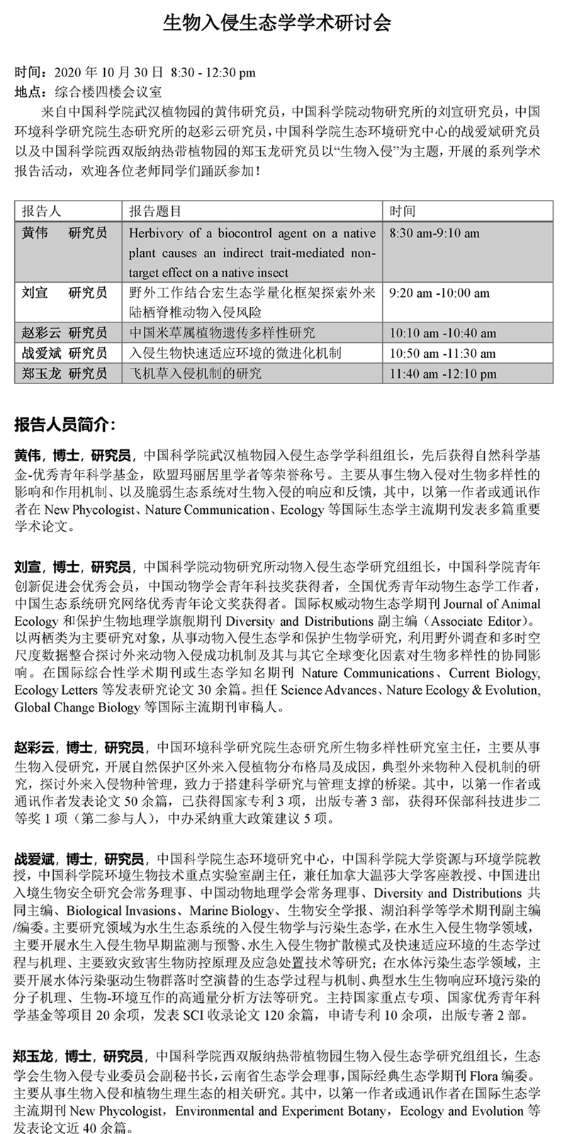 生物入侵生態(tài)學(xué)學(xué)術(shù)研討會(huì)通知-黃偉 研究員、劉宣 研究員、趙彩云 研究員、戰(zhàn)愛斌 研究員、鄭玉龍 研究員
